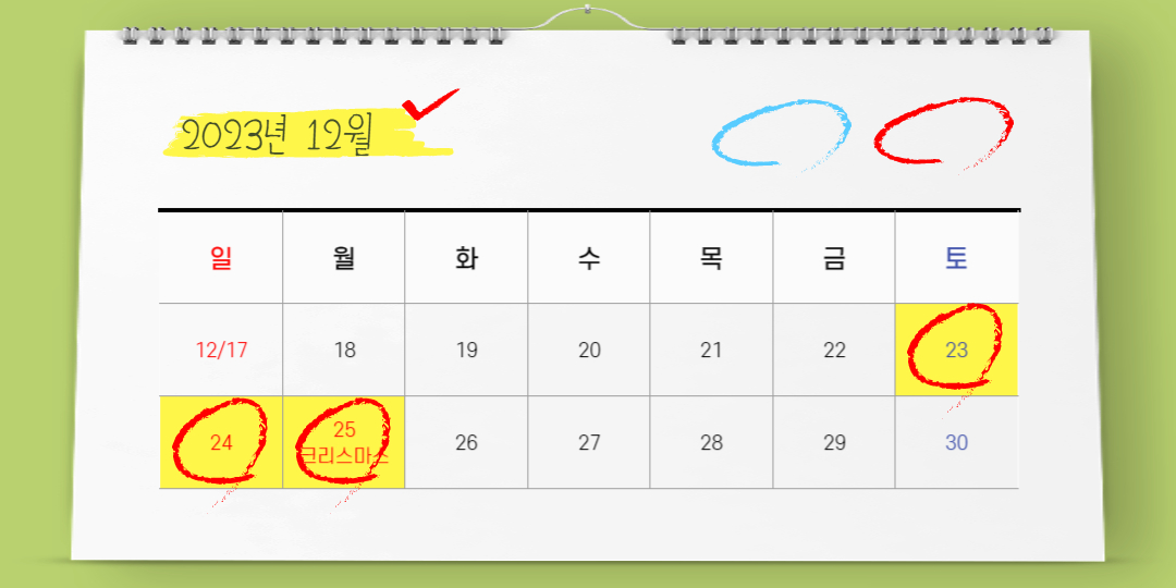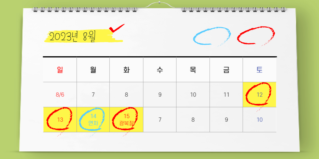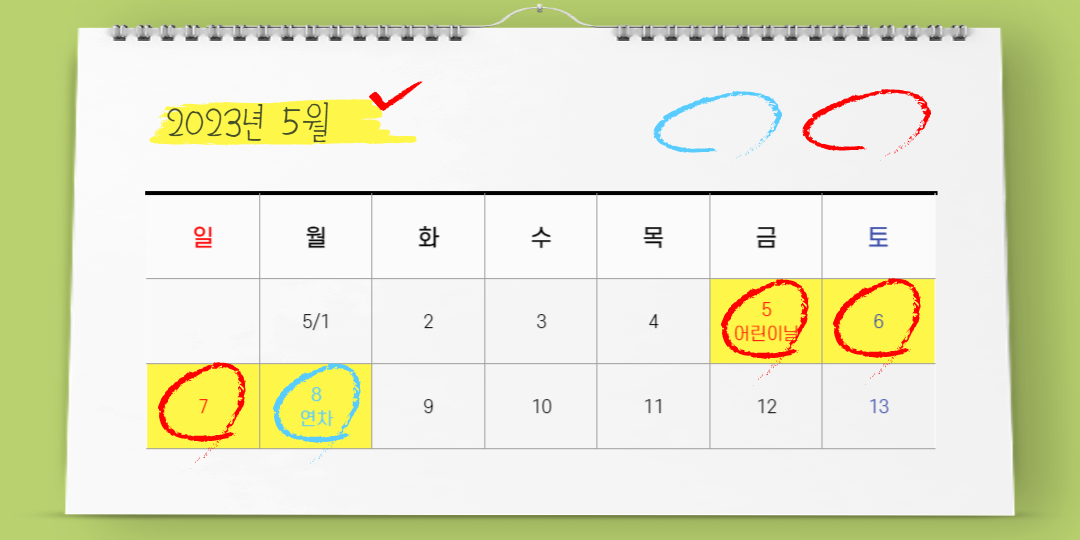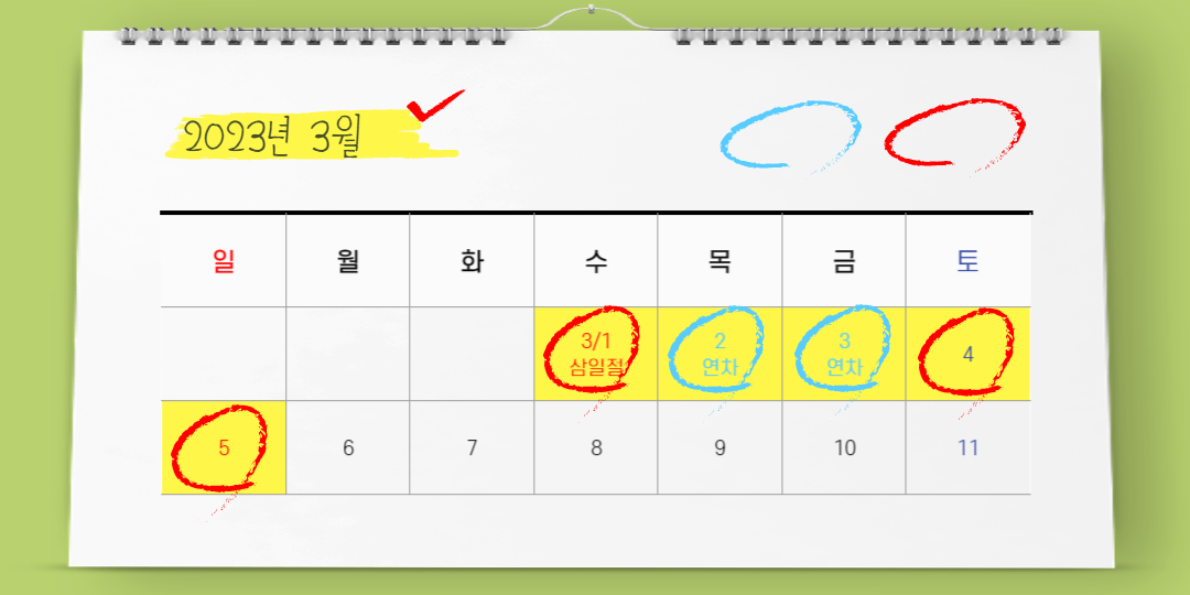 연차를 잘 활용 한다면 최대 12일까지 갈 수 있는 2023년 입니다.