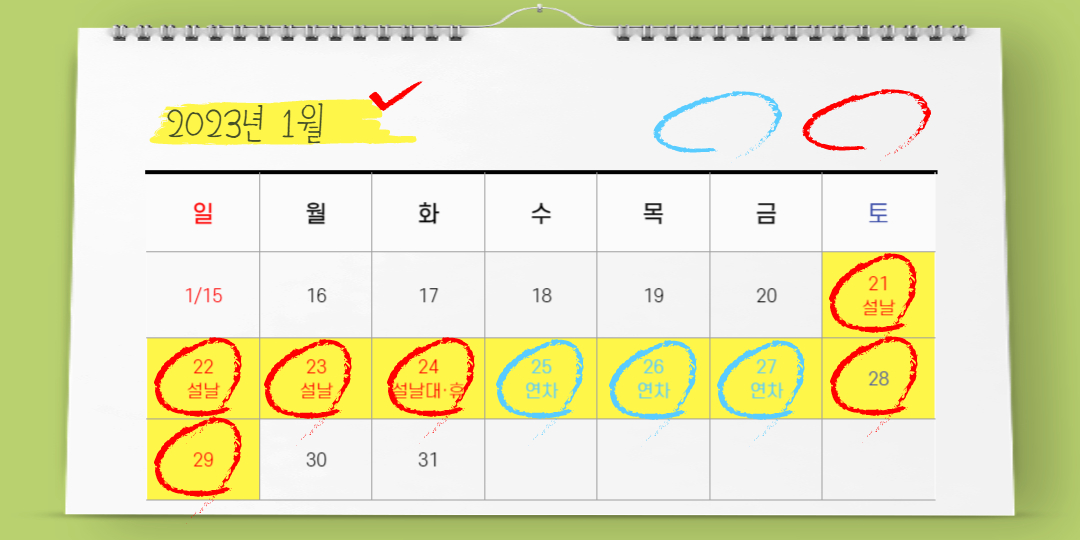 2023년 계묘년 휴일이 얼마나 있는지 궁금해 할 것입니다. 2023년 휴일을 알아보고 휴일 계획도 미리미리 계획하는것도 좋을거 같습니다. 각 달별로 휴일은 언제 일까요? 1월 1일(일) 신정 21~23일(토