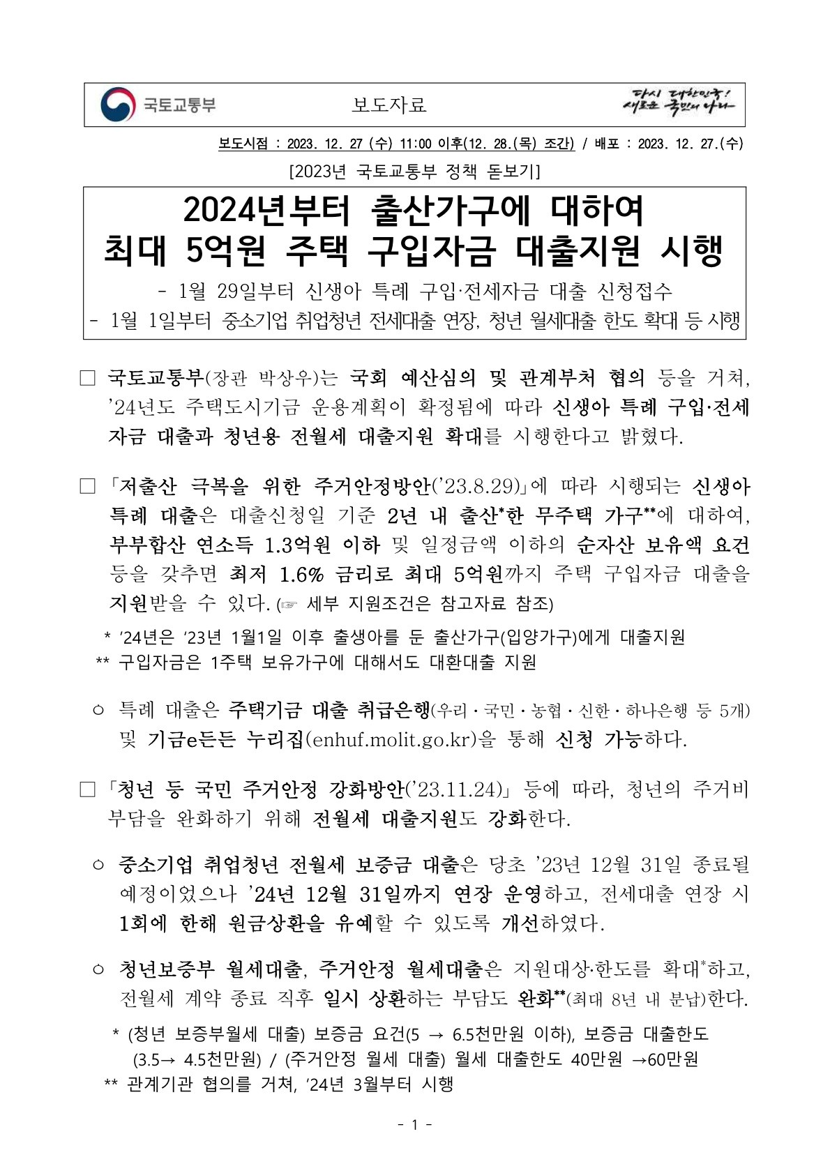 자세한 내용은 국토교통부 공식 발표 자료를 확인하세요. 주택 구입을 계획 중인 신생아 가구 및 청년들에게는 좋은 소식이 될 것으로 기대됩니다.