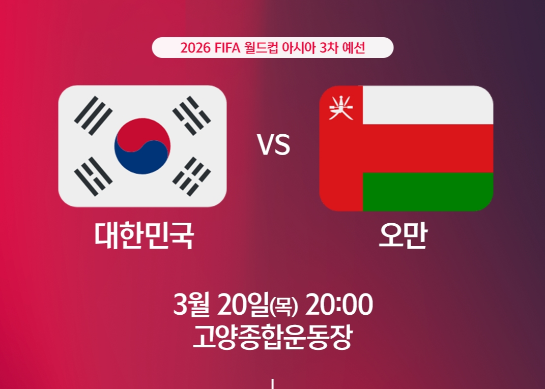 25년 3월 A매치 대한민국 vs 오만 2026년 월드컵 예선 티켓 예매 안내🏆 경기 정보✔ 경기대한민국 vs 오만✔ 일시2025년 3월 20일 (수) 20:00✔ 장소고양종합운동장(https://naver.me/xAFcp7Cg) 🎟️ 티켓 예